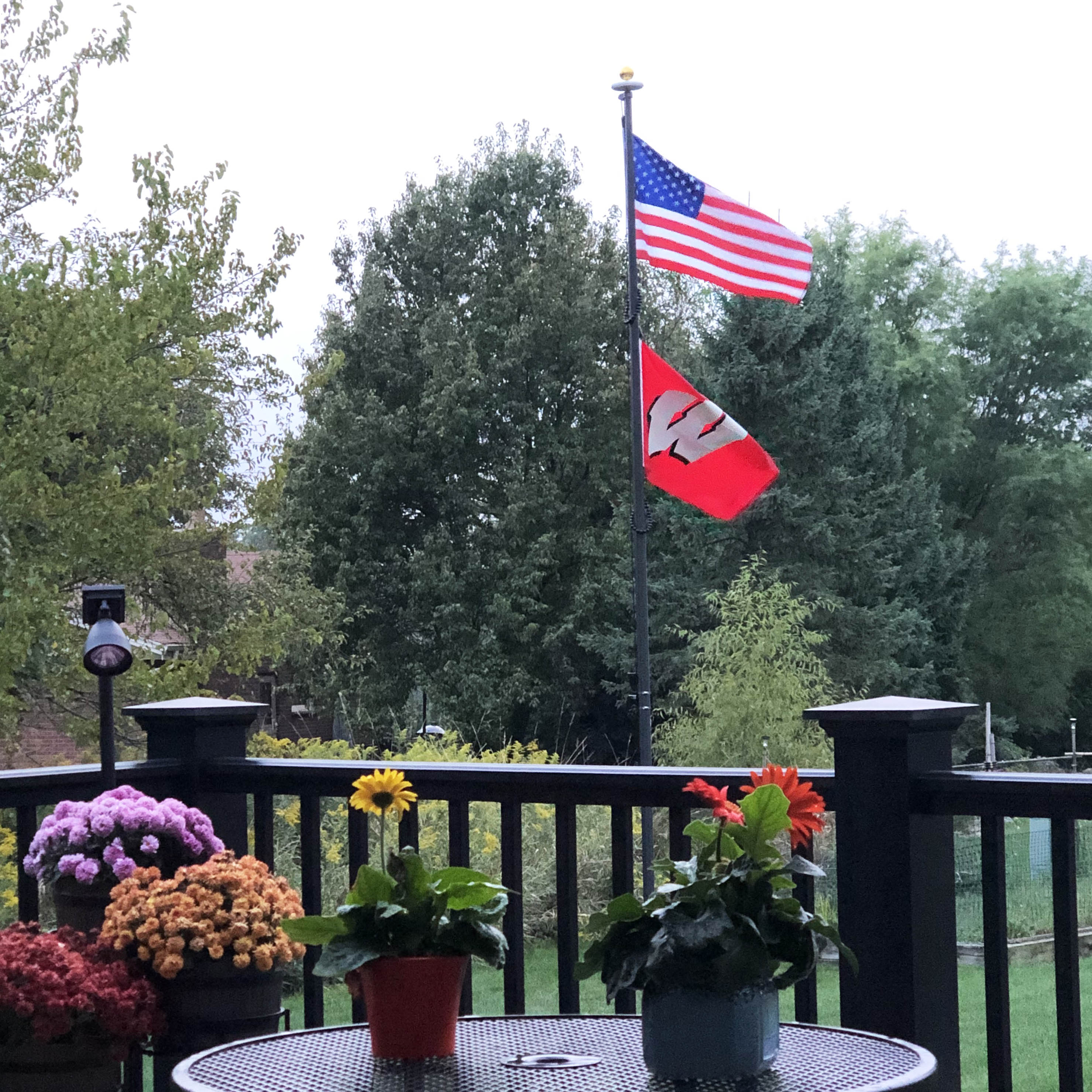 20' black external halyard flagpole. Flying a 3x5' U.S. nylon flag and a 3x5' University of Wisconsin flag.